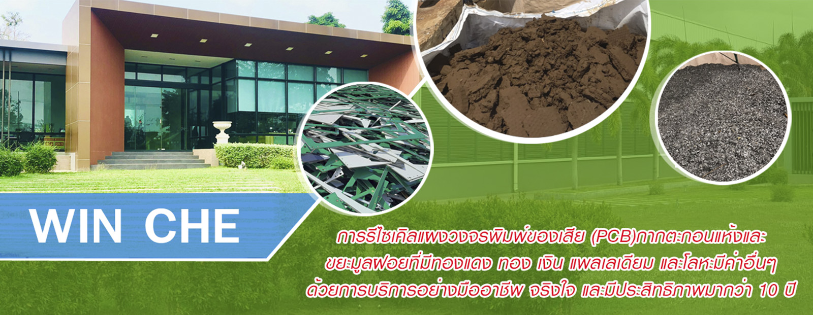 WIN CHE (THAILAND) CO., LTD. โรงงานซื้อและรีไซเคิลแผงวงจรพิมพ์ของเสีย (PCBs) เศษชิ้นส่วนอิเล็กทรอนิกส์และกากตะกอนที่ประกอบด้วยทองแดง ทอง เงิน แพลเลเดียม และโลหะหายากและมีค่าอื่นๆ ด้วยกระบวนการรีไซเคิลอย่างมืออาชีพของบริษัท เราช่วยลูกค้าจัดการกับปัญหาขยะอิเล็กทรอนิกส์ หลังจากนั้น คัดแยกทองแดง ทอง เงิน แพลเลเดียม และโลหะอื่นๆ ออกจากของเสียและส่งออกใหม่ เพื่อให้ของเสียสามารถนำกลับมาใช้ใหม่ได้อย่างมีประสิทธิภาพและสร้างมูลค่าเพิ่มของบริษัทต่อไป
