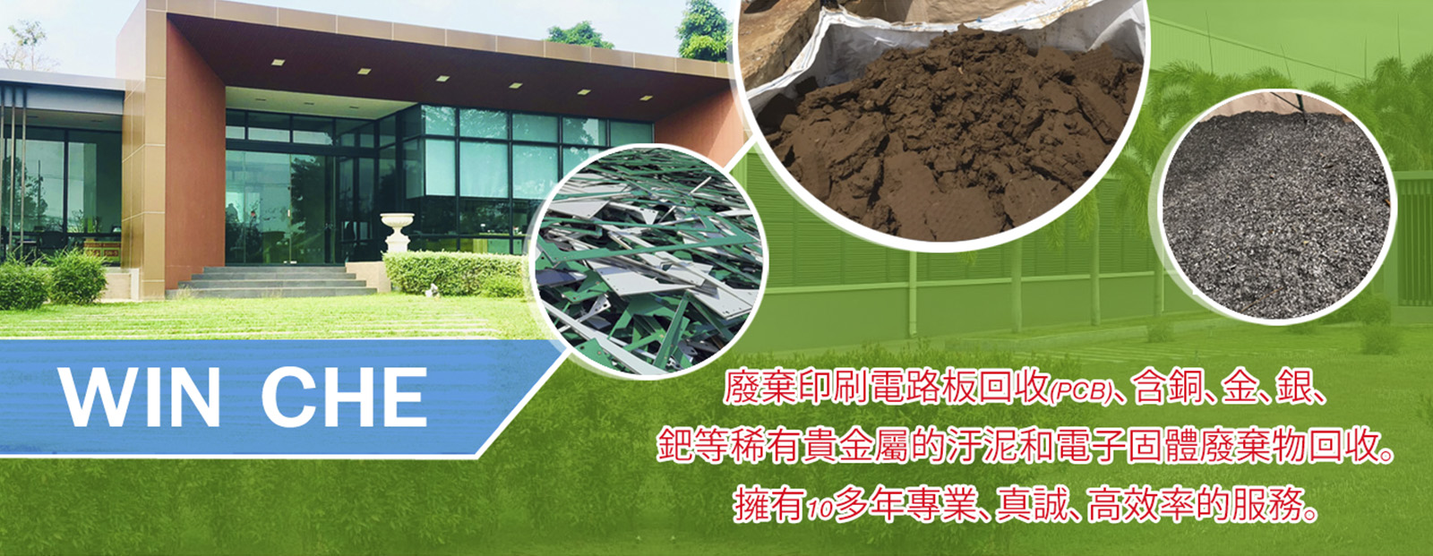 WIN CHE (THAILAND) CO., LTD.本工廠採購並回收廢印刷電路板 (PCB)、廢電子零件、電鍍軋機的乾燥污泥和包含銅、金、銀、鈀等稀有貴金屬的固體廢棄物。透過本公司專業的回收處理流程,協助客戶處理電子廢棄物的問題,並從中提取銅、金、銀、鈀等金屬後重新輸出,使廢棄物達到有效再利用且進一步創造出公司的價值。